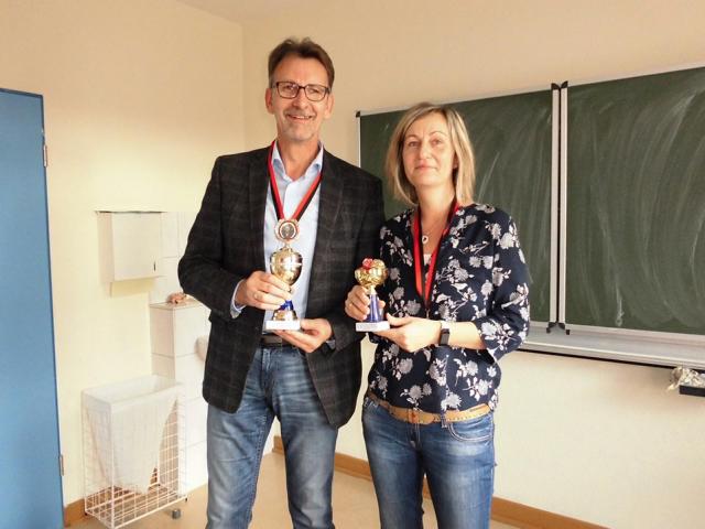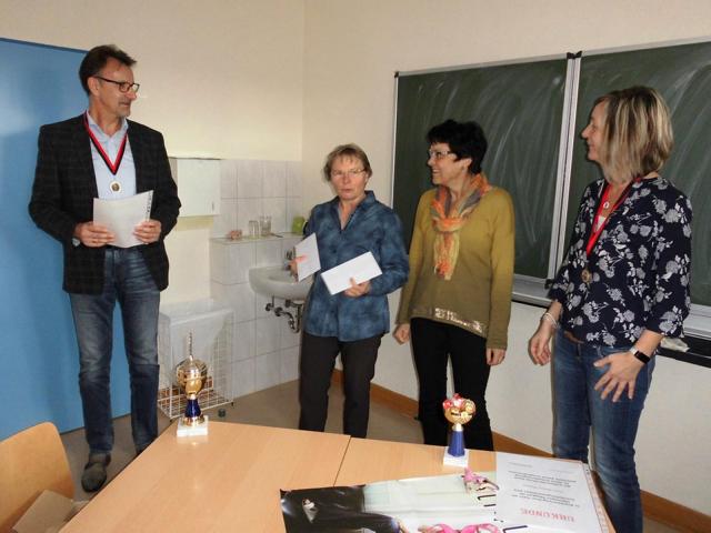 Doch was ist ein Schulleiter ohne seine Chefsekretärin? Seit 1999 übt Andrea Behrens diesen Posten zur vollsten Zufriedenheit aller bisheriger Schulleiter aus. Ebenfalls unter begeisterndem Beifall der Anwesenden konnte auch sie einen mit Süßigkeiten gefüllten Ehrenpokal, eine Goldmedaille, eine Urkunde sowie einen Gutschein in symbolischer Höhe von 10 Euro in Empfang nehmen.