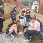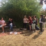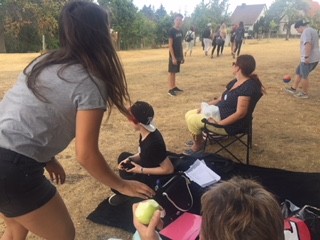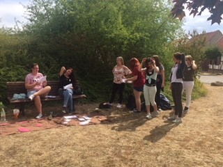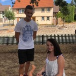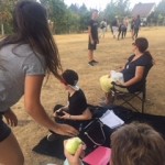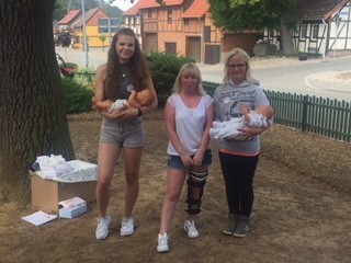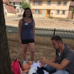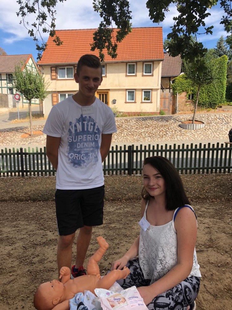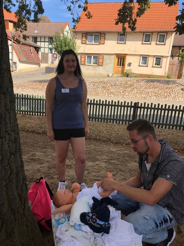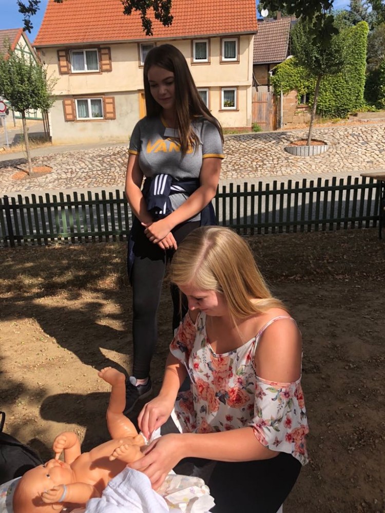 Auf Grund der starken Hitze in den Wäldern Langensteins (Waldbrandstufe 5), wurde der Tag auf den Schäferhof verlegt. Beide Klassen wurden zusammen in sieben Gruppen eingeteilt und mussten fünf Stationen absolvieren. Die Stationen bezogen sich auf die Berufsausbildung Kinderpflege z.B. wie man ein Babys richtig wäscht oder wickelt.