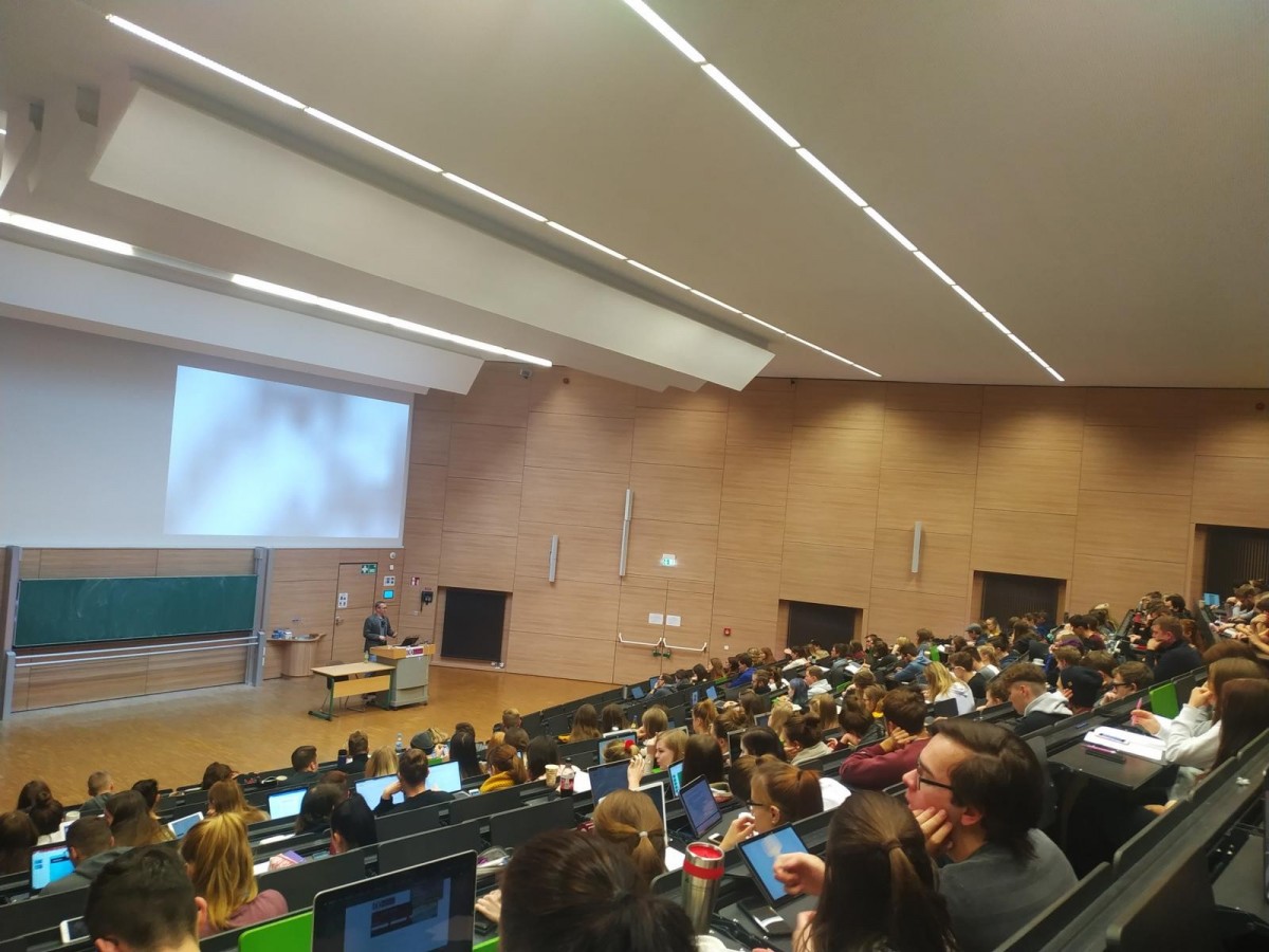 Anschließend nahmen wir an zwei Vorlesungen teil. Wir besuchten eine Mathematikvorlesung für Ingenieure und die Vorlesung „Pädagogik und Medienbildung“. In solch großen Hörsälen zu sitzen und sich eine Vorlesung live anzusehen war für uns eine lehrreiche Erfahrung. Nach den zwei Vorlesungen mussten wir uns erst einmal stärken und begaben uns auf den Weg in die Universitätsmensa, in der wir uns alle eine warme Mahlzeit gönnten. Nachdem alle satt waren, führte unser nächster Weg in das Informationscenter der Universität, wo wir an einem Studententalk teilnahmen.