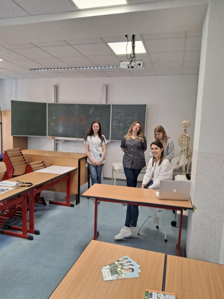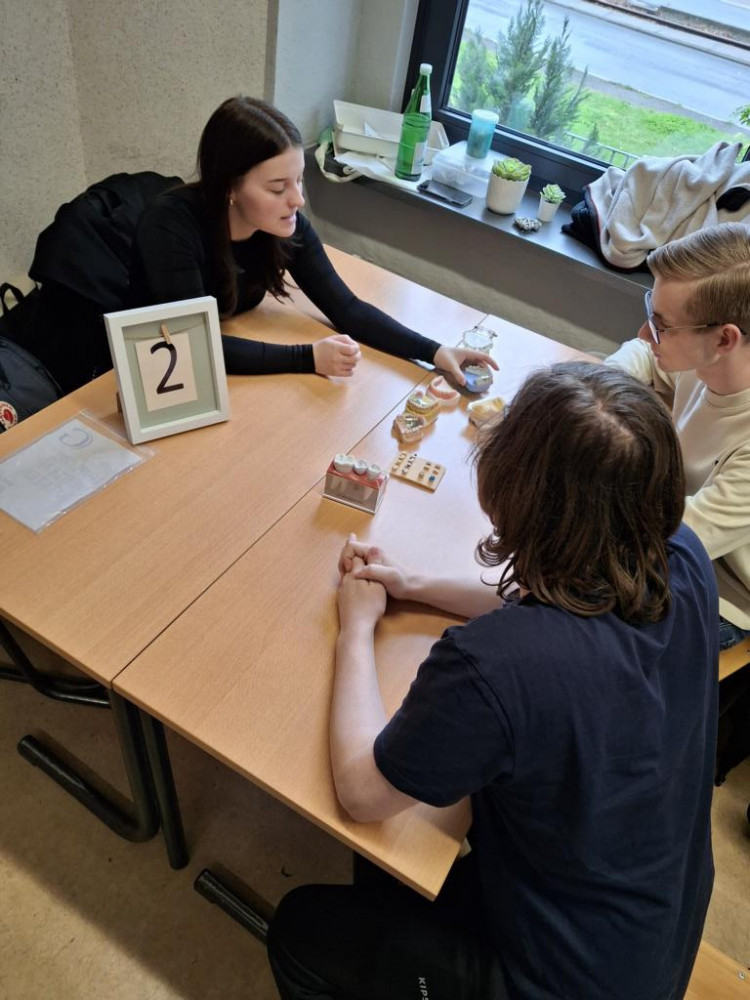 Nach einer kurzen Pause hielten die Medizinischen Fachangestellten des 1. Ausbildungsjahres zunächst eine Präsentation mit Informationen zum Beruf und im Anschluss ein Escapegame für unsere Besucher/-innen bereit. Dabei begleiteten sie einen Patienten vom Empfang in der Arztpraxis, über das Wartezimmer und dem Behandlungszimmer bis zum Labor und lösten dabei kleine Rätsel. So konnte am Ende eine Diagnose erstellt werden und zur Belohnung gab es ein Stück Kuchen, das dekoriert war mit Puddinggehirn und Puddingblut.