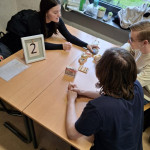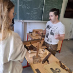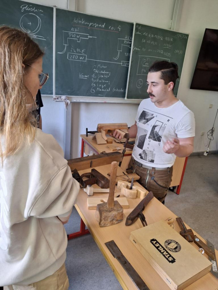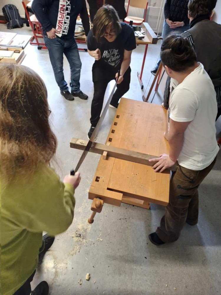 Im Anschluss wurden unsere Gäste schon von den angehenden Tischler/-innen im 3. Ausbildungsjahr erwartet. Neben einer eindrucksvollen Sammlung von Werkzeugen, demonstrierten die Azubis typische Aufgaben wie Hobeln und Sägen. Auch hier konnten die interessierten Schüler/-innen sofort selber Hand anlegen. Ein Quiz zu Holz- und Baumarten und Infos zu technischem Zeichnen durften nicht fehlen.